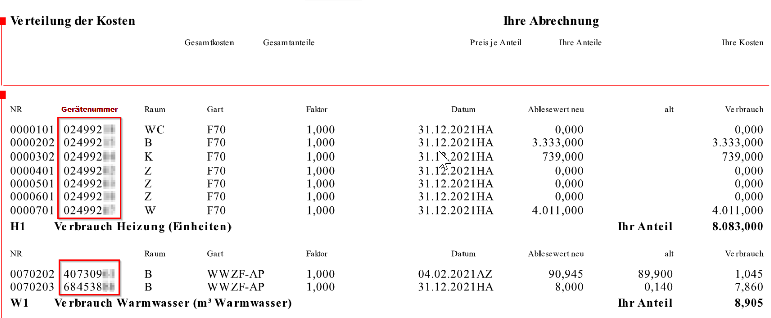 Your document contains at least one device number, if necessary also several device numbers. Each of these numbers can be used as verification for your apartment. Enter exactly one of the numbers in the field provided ("device number"). You may not enter all the numbers, but any device number located on your billing statement. The device numbers are usually located at the bottom of the first page of your billing statement.